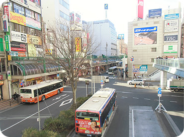 北千住駅前西口ロータリー2階です。中央にアーケードのあるバス通り「北ロード1010」が見えます。この道を進むと迷いにくいです。