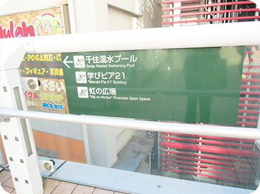 ②エレベーターとエスカレーターの間に千住温水プールへの案内板が見えます。