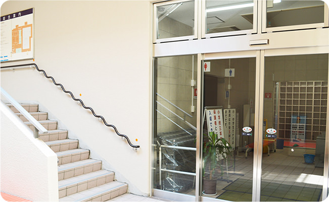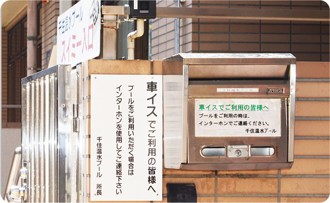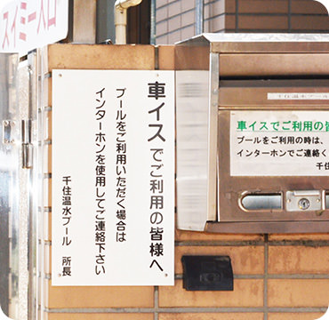 車椅子の方はインターホンを押していただければ、スタッフがプールまでご案内いたします。