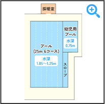 6コース、全長:25m×幅:13m 水深1.05~1.25m。