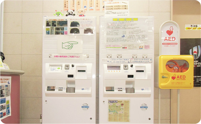 券売機で利用券を購入してください。回数券は総合受付で販売しています。