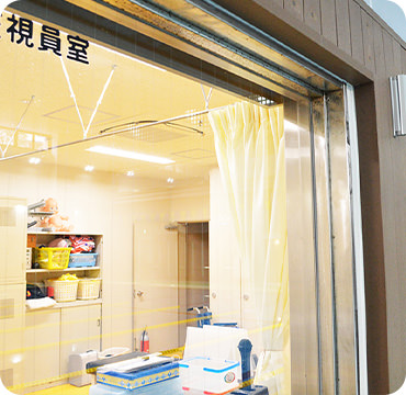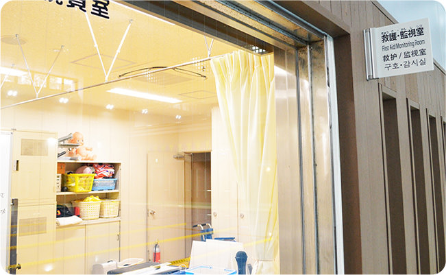 監視員がこちらからもプールを監視しています。館内放送、体調が悪化された方の救護をこちらで行います。