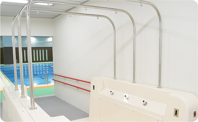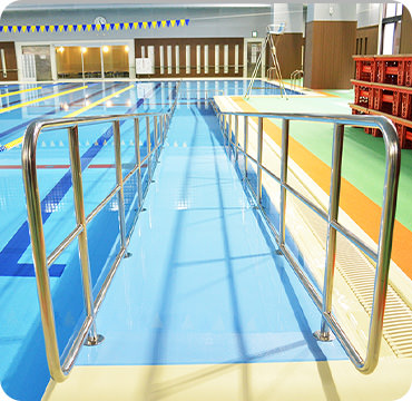 階段に比べて容易にプールに入水できるようになりました。滑る場合がありますので、手すりにおつかまりになってご利用ください。